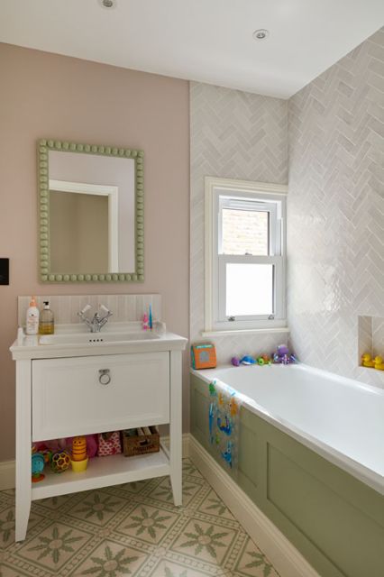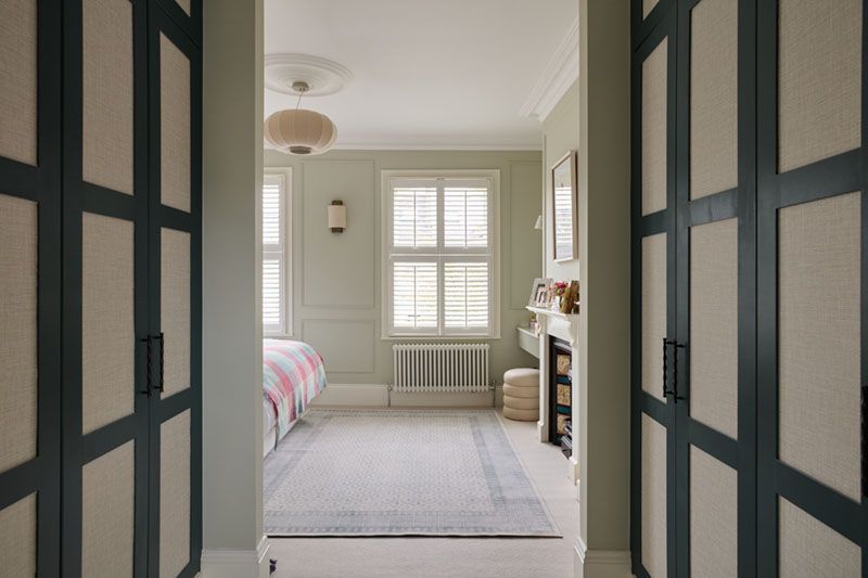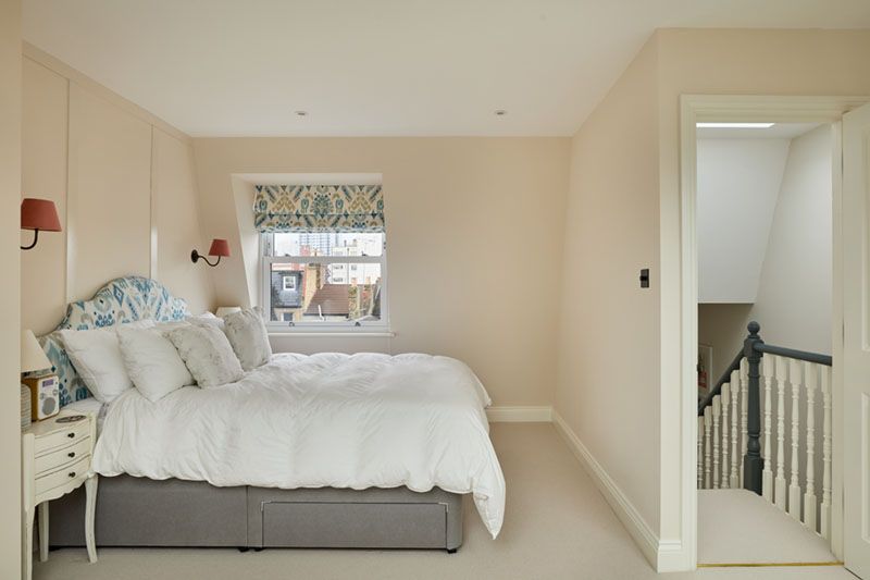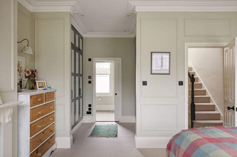The loft in this Victorian house was quite large, and our client aimed to utilise that for guest bedroom and wanted to build an L-shape off the back of the house in order to add a large bathroom. The bedroom is completely lit up from both side by fitted Velux window and a dormer window on the other side and in the hallway, a roof light floods the stairwell with natural light. It not only created a way for natural light but also increased ventilation in the room. The staircase leads down from the loft to the two newly refurbished bedrooms: one master bedroom with huge shower room and closet space, and one cozy yet spacious kids’ room right across the hall from it. The master bedroom is airy and perfectly illuminated by two huge windows. The room has a lot of space for easy navigation to the dressing area and an ensuite bathroom. The dressing area consists of huge built-in closets that can store all the regular and seasonal belongings in place. The shower room has a luxurious shower closet with shelves. The kids’ room has most cosy vibe in the entire house, it is well-lit and is decorated with lively colours and various kinds of storage options. The family bathroom is equally cozy and has a bathtub and a separate shower.