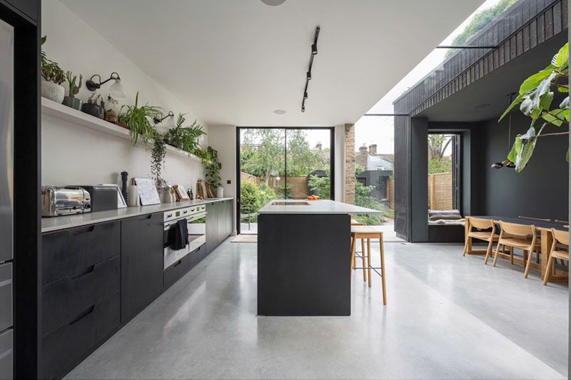 The new kitchen + diner is now a modern and spacious area with a lot of space to walk around. The kitchen is converted into an open plan kitchen with an island unit that provides ample storage along with increased workspace. The kitchen area is illuminated by glass sliding doors which brings in lights that fills in the entire space. With these windows, glass door overlooking the garden and glazed roof the room now feels connected to the outdoors with ease.