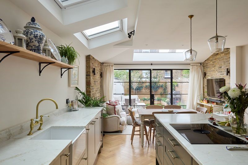 With the rear extension, the kitchen is now accommodating new island unit, diner area and spacious sitting area that is close to the glass French door, further extending the kitchen to the outside patio. The kitchen is not only well organised with the new extension layout but is also well illuminated by the huge roof lights that allow maximum natural light to enter the space. These roof lights are the best feature to be added with a kitchen extension that are not just stylish but highly functional.