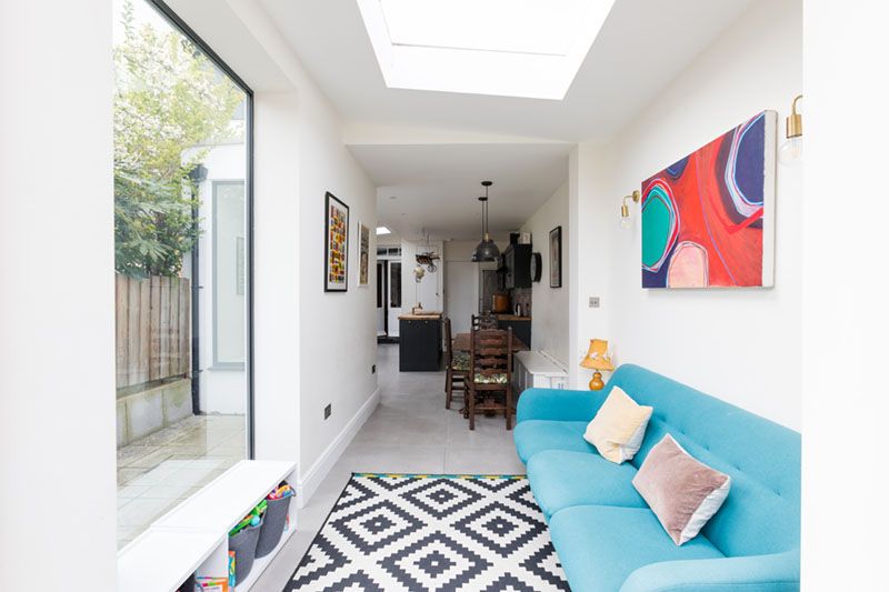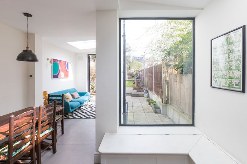 This L-shaped rear side return extension opened up the space in the back of the house to create a large functional and bright area for all the family to enjoy. Our clients wanted large windows and doors out to the patio and garden and the roof lights on the pitched roof flood the work spaces with plenty of light. The overall space is incredibly social with an oriel window with window seat allowing guest to relax while the hosts work in the kitchen area. The L-shaped extension to the rear allows for a large dining table and a nice cosy and relaxing seating area with views and direct access to the garden. Here, rather than bifolding doors, we added one large window door that opens fully to the garden. Allowing full access to the garden from the kitchen. This extension design fully modernised this Victorian terraced house and provided our clients with much needed additional family space. In terms of the décor, our client very tastefully mixed modern conveniences with a traditional aesthetic. It has resulted in a beautifully calm and relaxing space.