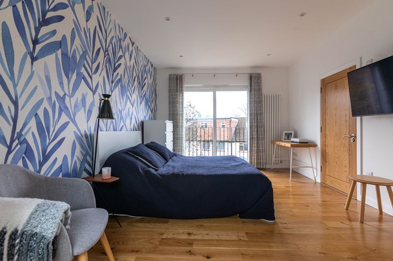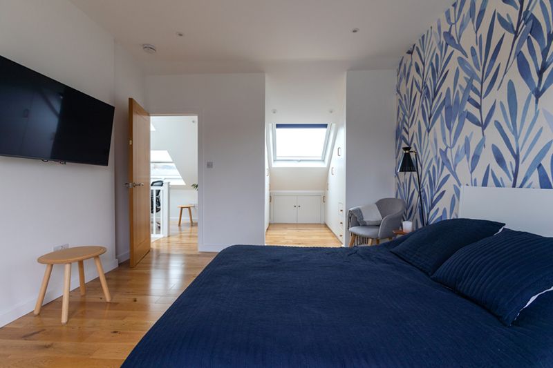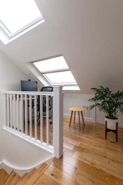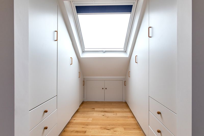 The loft was reconfigured to include a dormer to have maximum headroom for the bedroom, a Juliette balcony with French doors to bring abundant natural light and brighten up the entire space. Velux widows were added for efficient ventilation and to illuminate the corners of dressing area and office area opening the space. Underneath that, the entire space was utilised for Eaves storage, that is wonderful for families with children to keep the area organised, this focuses on maximizing the use of every corner of the loft space.