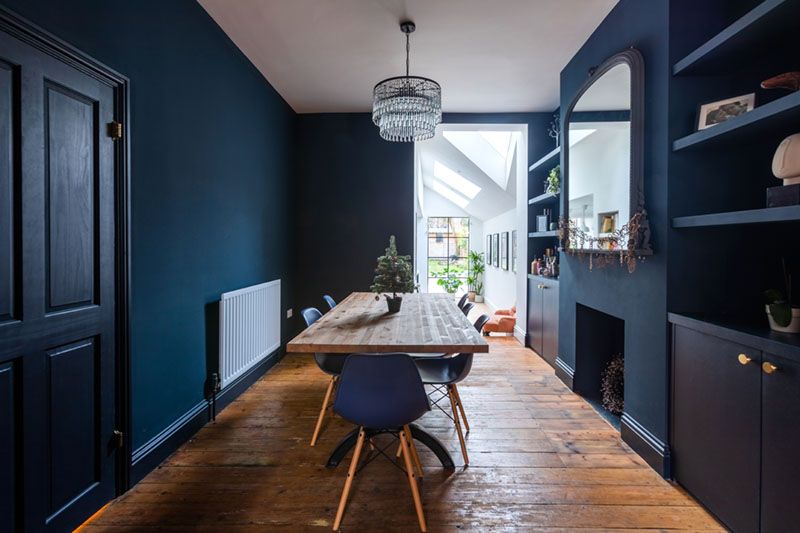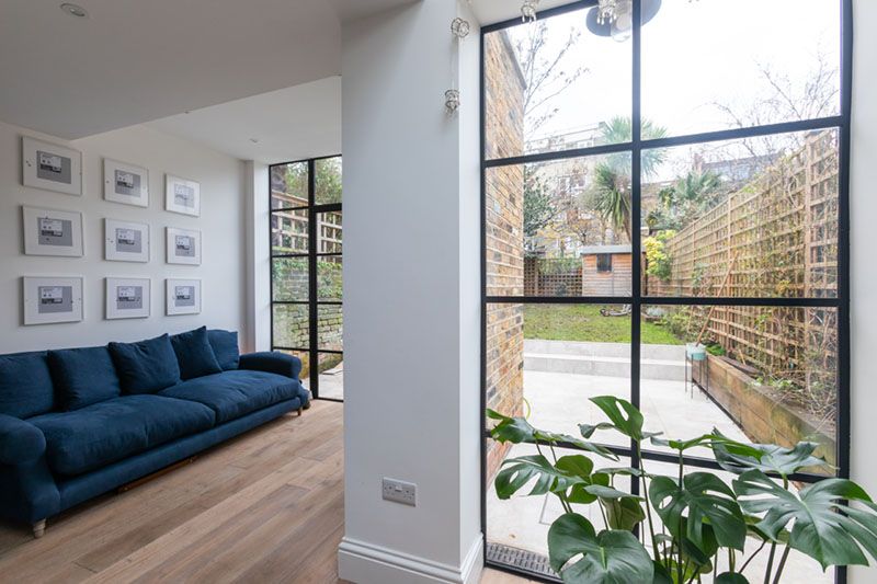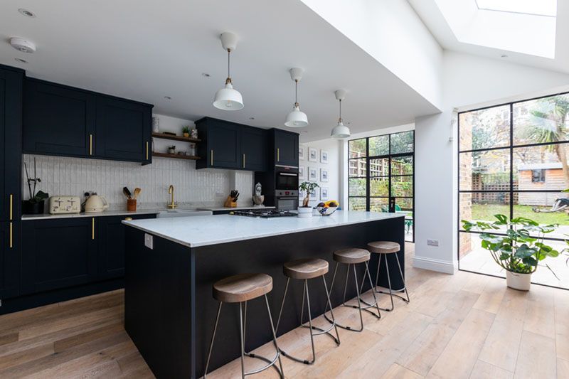 For the kitchen, our clients wanted to extend all the way to the side with a side return extension in order to maximise the space in the kitchen. This space needed to be both functional with a large kitchen area and social with a nice relaxing space leading to the patio. The original layout featured two reception rooms and a separate access for kitchen. The idea was to redesign the entire floor by making a seamless movement from the front of the house to the rear. To execute that, we merged the two reception rooms transforming it into a huge room that now included the dining area. The large kitchen extension features large cabinets for storage and a large workspace with the island unit all of which are illuminated by the large roof windows. The open plan layout coupled with the large roof windows and glazing makes the area feel spacious and bright with natural light and air flow throughout floor. The extension now allows a view of the garden through a full height glass window and French doors, creating a bright and airy environment perfect for modern living.